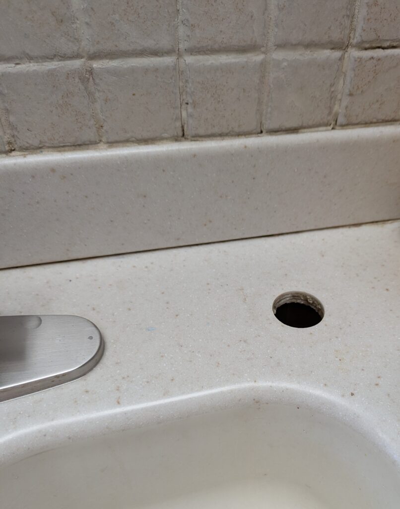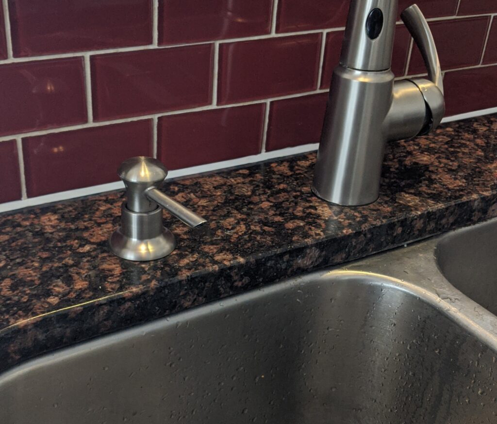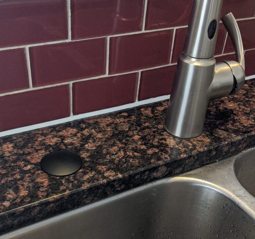 I knew about this from having done this in my own home. My sink had a hole that was originally for a sink hose. We switched the faucet (after it broke and was not repairable) to one with a built in hose so there was hole. For a while we had little filtered water spout, but that went away when we had to buy a new fridge (also broke and was not repairable despite my husband’s bet efforts). Then I installed a soap dispenser which is never sturdy and makes a mess so it had to go. So the hose -> water -> soap dispenser -> empty hole that needed covered.