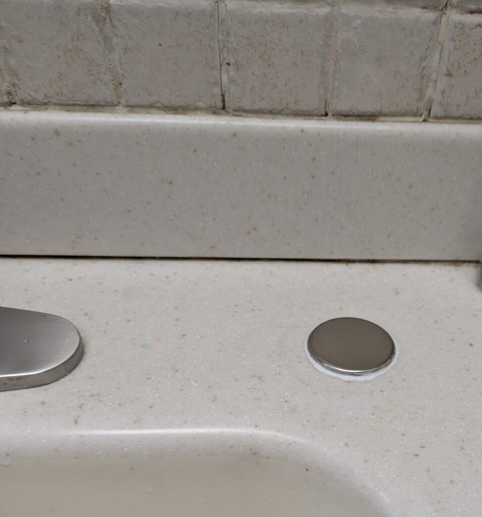 I cover all the R’s here and Repair is one of them. This particular featured image is where a soap dispenser used to be. It was caked in soap underneath which was an exercise in acrobatics to fit under the sink and clean that! That was not a good spot for a garbage disposal! There wasn’t going to be anything else installed in the hole and I don’t want water dripping through and pooling or causing mold under the sink so I needed to cover it.