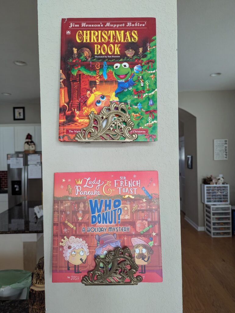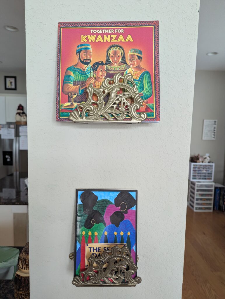 I switched our Christmas books: Jim Henson’s Muppet Babies’ Christmas Book, and Lady Pancake and Sir French Toast Who Donut for Kwanzaa books: Together for Kwanzaa and The Seven Days of Kwanzaa.