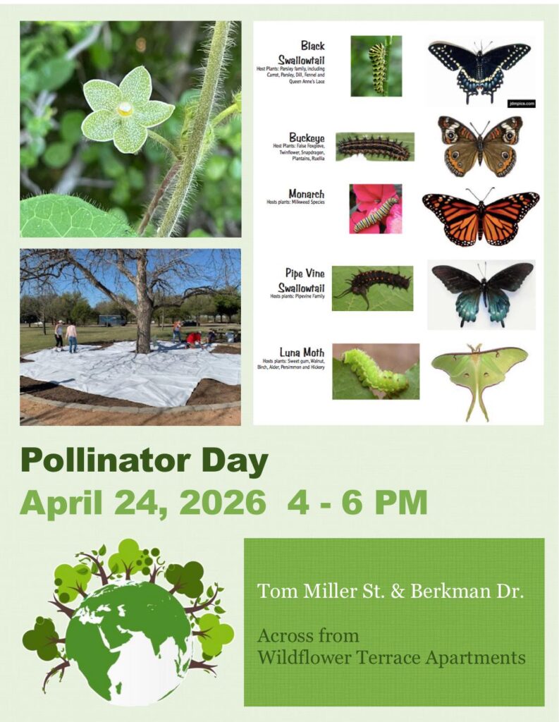 The Mueller Landscape Committee will host its 5th annual Plant a Pollinator Garden event next month in the Southeast Greenway near Tom Miller Street and Berkman Drive (across from Wildflower Terrace). In honor of Earth Day, participants can: