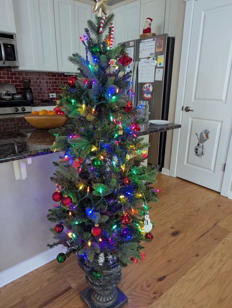 The strings were intricately woven into the branches and there were little plastic clips also holding them on. This just made an absolute horrendous mess when we undid the string lights. My 18-year-old 7 foot slim tree when it was about 8 years old had two of its three tiers die and I cut the lights off with my mom and we restrung that tree. I don’t remember there being this much waste and there weren’t plastic clips on our main tree, the little one is my son’s, so each tree is different.